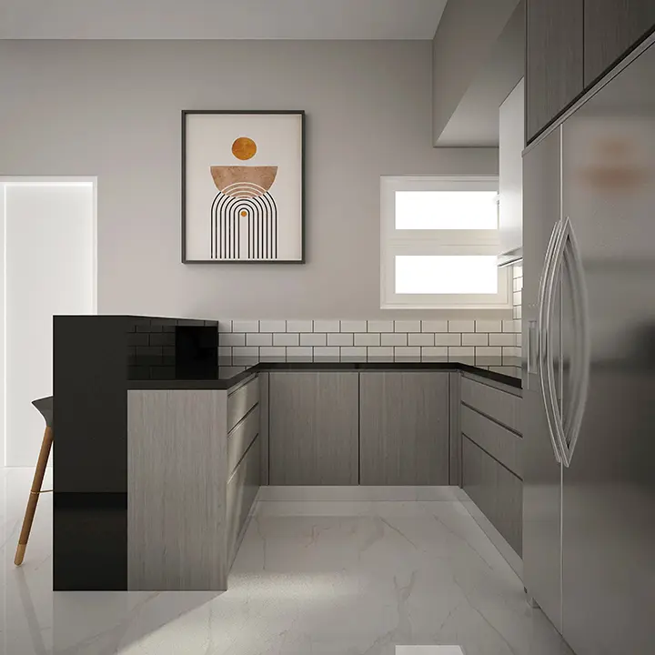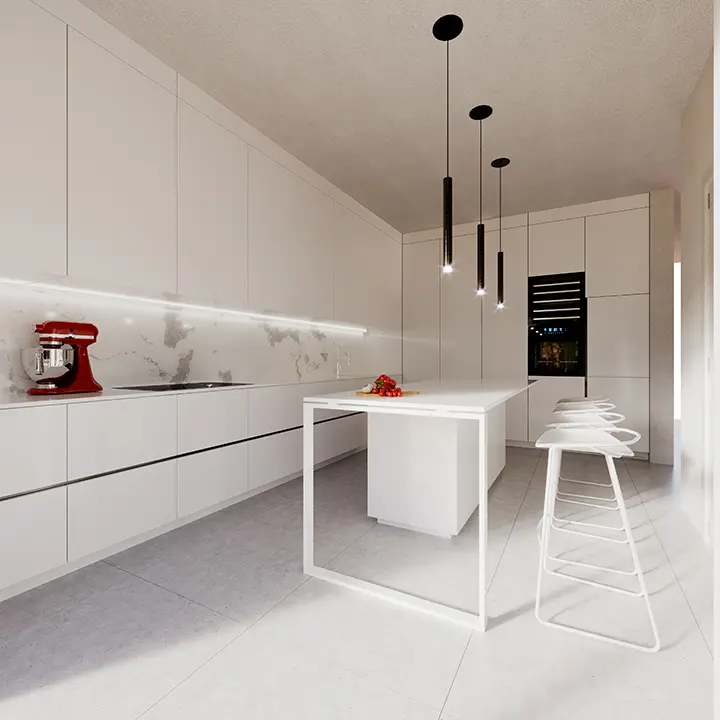 Traktujemy kuchnie wizualizacje nie jako dodatek, lecz jako integralną część języka, którym posługujemy się w dialogu. Jest to uniwersalny język sztuk wizualnych. Przekłada on techniczne rzuty i zestawienia materiałowe na zrozumiały i emocjonalny obraz. To właśnie na tym etapie koncepcja nabiera realnych kształtów. Klient po raz pierwszy może „wejść” do swojego przyszłego wnętrza. Może ocenić proporcje, układ i, co najważniejsze, poczuć jego atmosferę.